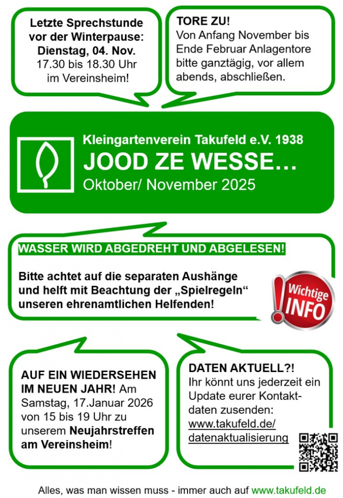 Im Newsletter der Fachberatung unseres Vereins werden aktuelle, saisonale Tipps und Hinweise „Rund um den Kleingarten“ gegeben. Bei Interesse bitte Anmeldebogen per Email über fachberatung@takufeld.de anfordern oder Raimund Erdmann und Meike Helm ansprechen.
